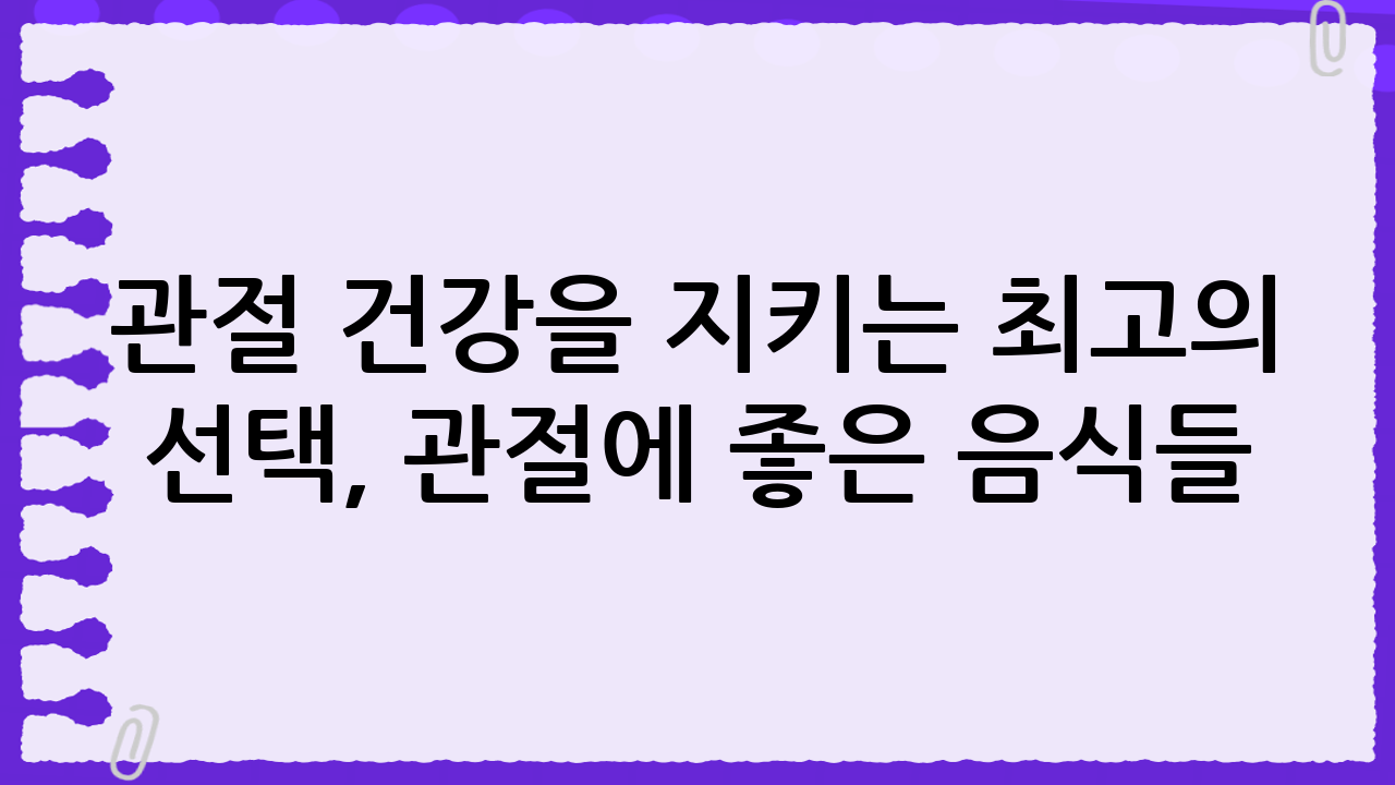 관절에 좋은 음식들을 꾸준히 섭취하고 건강한 식습관을 유지하는 것은 관절 건강을 지키는 가장 효과적인 방법 중 하나입니다. 위에 소개된 음식들을 식단에 적극적으로 포함시키고 꾸준한 운동과 함께 건강한 관절을 유지하시길 바랍니다. 지금부터라도 관절 건강을 위한 노력을 시작하여 활기찬 삶을 누리세요!