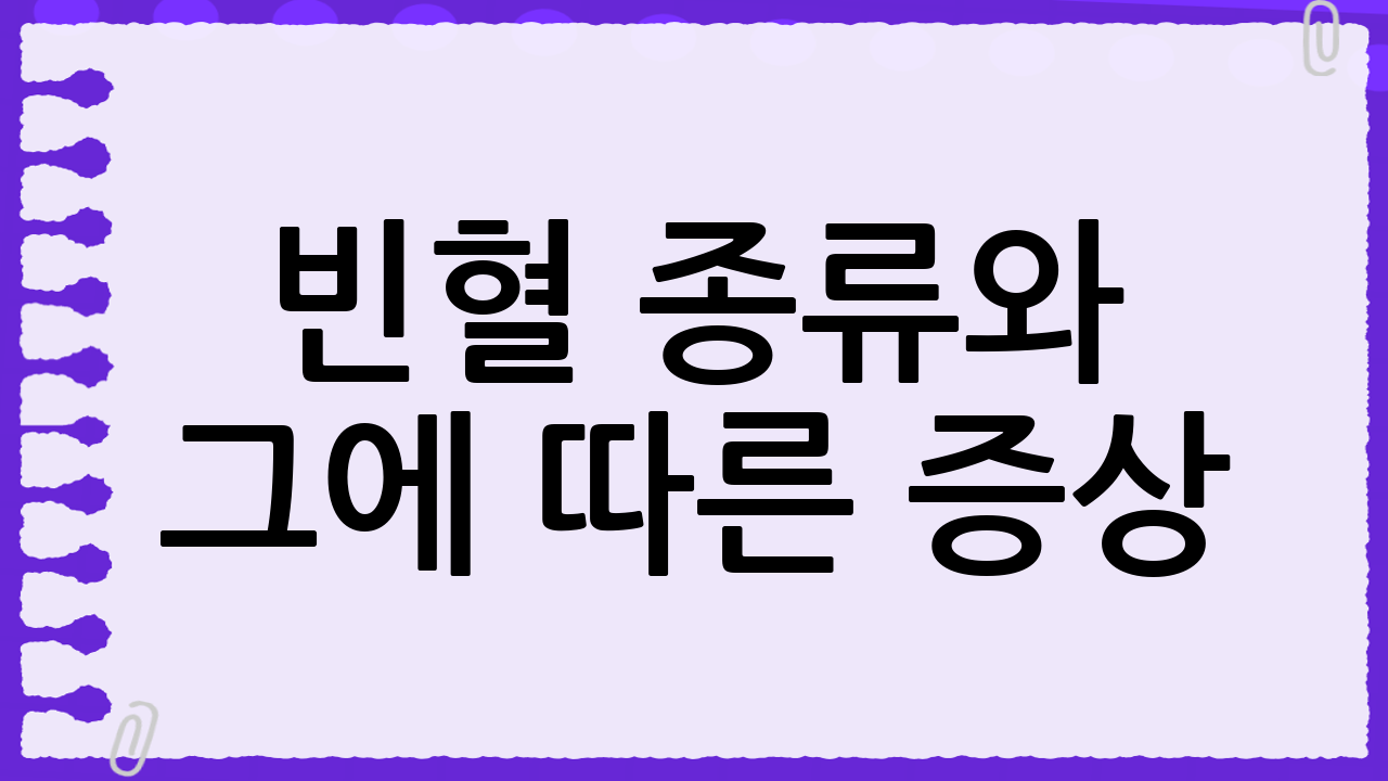 빈혈은 다양한 원인에 따라 여러 종류로 나눌 수 있으며, 각 종류에 따라 나타나는 증상도 조금씩 다를 수 있습니다. 철결핍성 빈혈은 철분 부족으로 인해 발생하며, 가장 흔한 형태의 빈혈입니다. 거대적아구성 빈혈은 비타민 B12 또는 엽산 부족으로 인해 발생하며, 신경학적 증상을 동반할 수 있습니다. 재생불량성 빈혈은 골수의 기능 저하로 인해 발생하며, 심각한 감염이나 출혈을 유발할 수 있습니다. 용혈성 빈혈은 적혈구가 과도하게 파괴되어 발생하며, 황달이나 짙은 소변색을 동반할 수 있습니다.
