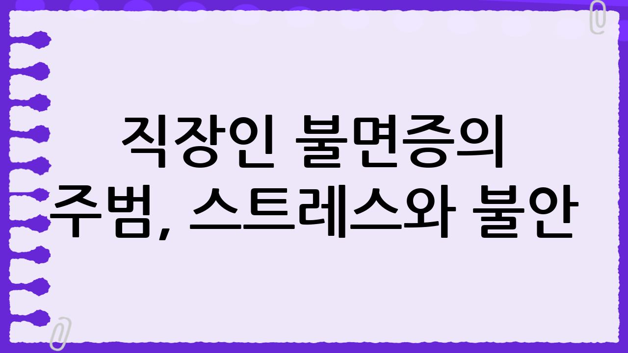 직장인 불면증의 가장 큰 원인은 바로 스트레스와 불안입니다. 업무 압박, 인간 관계, 미래에 대한 불안감 등이 밤에도 머릿속을 떠나지 않아 잠을 설치게 만들죠. 특히, 중요한 프로젝트를 앞두고 있거나 어려운 상황에 놓여있을 때는 더욱 심해질 수 있습니다.