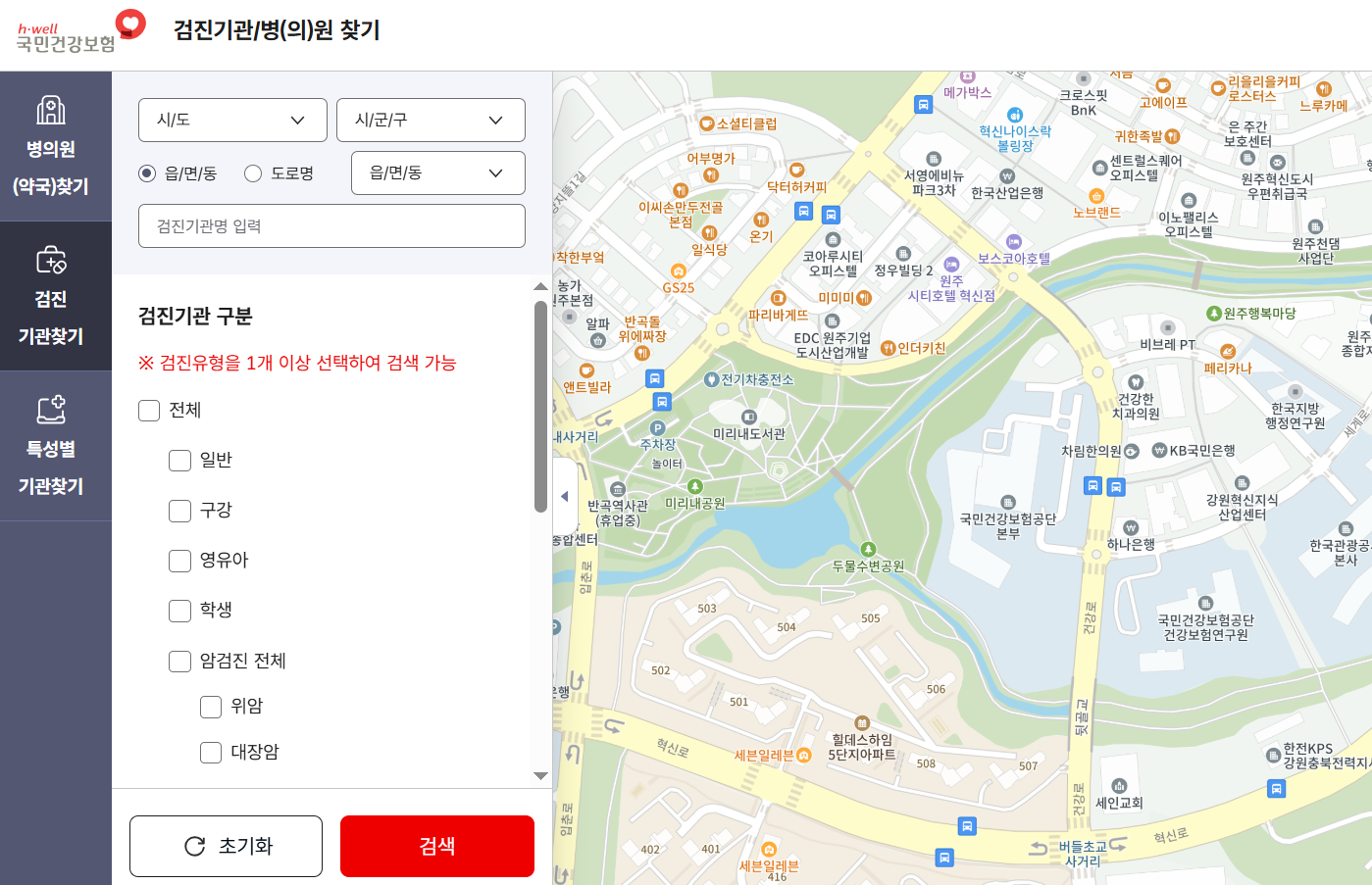 검진기관 검색 시스템이 훨씬 간편해졌습니다.
