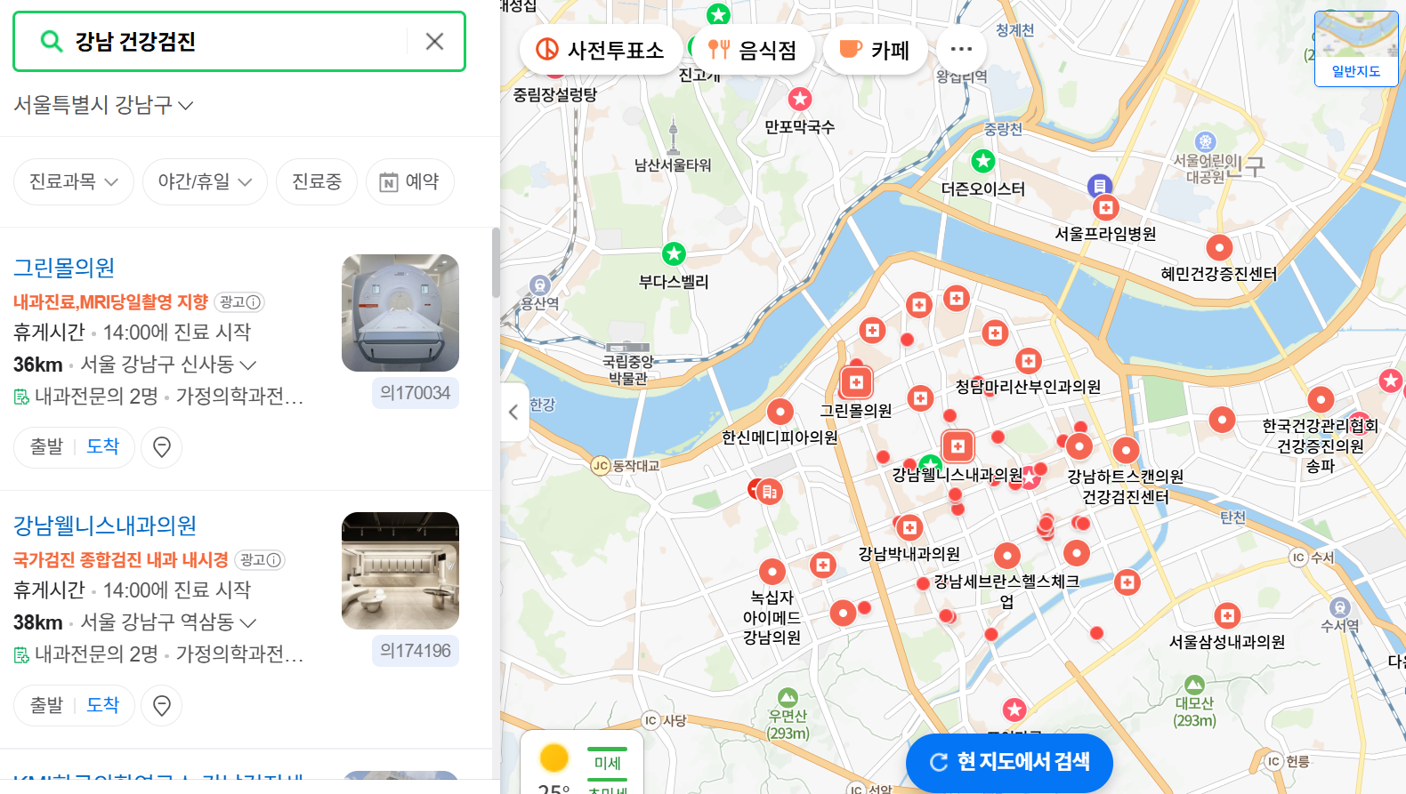 네이버 지도로 ‘건강검진 병원’ 키워드 검색 시,