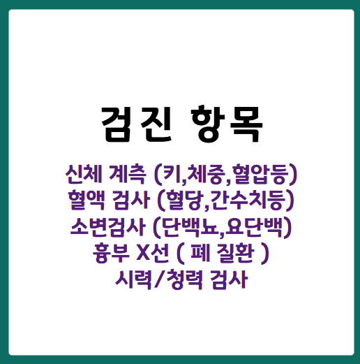 | 혈액검사 | 공복혈당, 콜레스테롤, 간수치 등 |